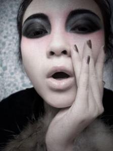 盛唐时期(即杨贵妃所处的时期)流行的眉妆有蛾眉、远山眉、青黛眉等,比起阔眉来细且淡。《开元天宝遗事》里写到杨贵妃冬天奉招去宫中,临走与父母告别,流下的泪冻成了红色的冰珠,还有一次写她夏天太热,用手帕擦汗,擦完的手帕都被染红了。